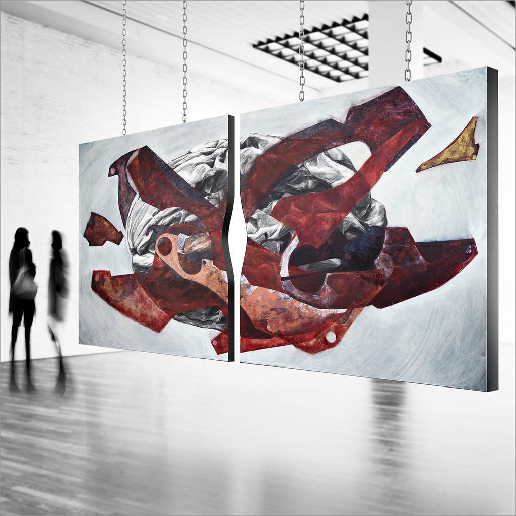 Diptyque. Installation suspendue avec deux cotées. Monotype, acrylique, fusain, pastel. Panneaux en bois découpés, chaines.